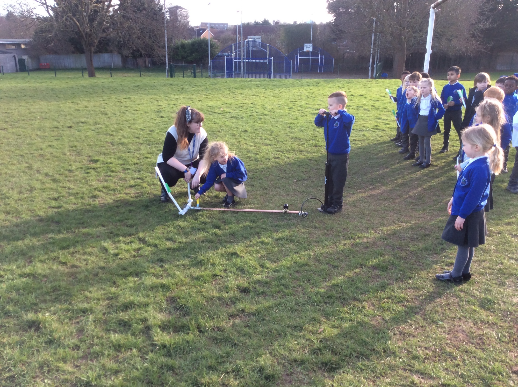 Reception and KS1 took part in our challenge in the run-up of the day. We defined and built rockets then launched them using the specially-built equipment from STEM. This used a bicycle pump to compress air and the rockets shot for really impressive distances! We measured using a trundle wheel and Toby in Year 2 shot his over 12 and a half meters!