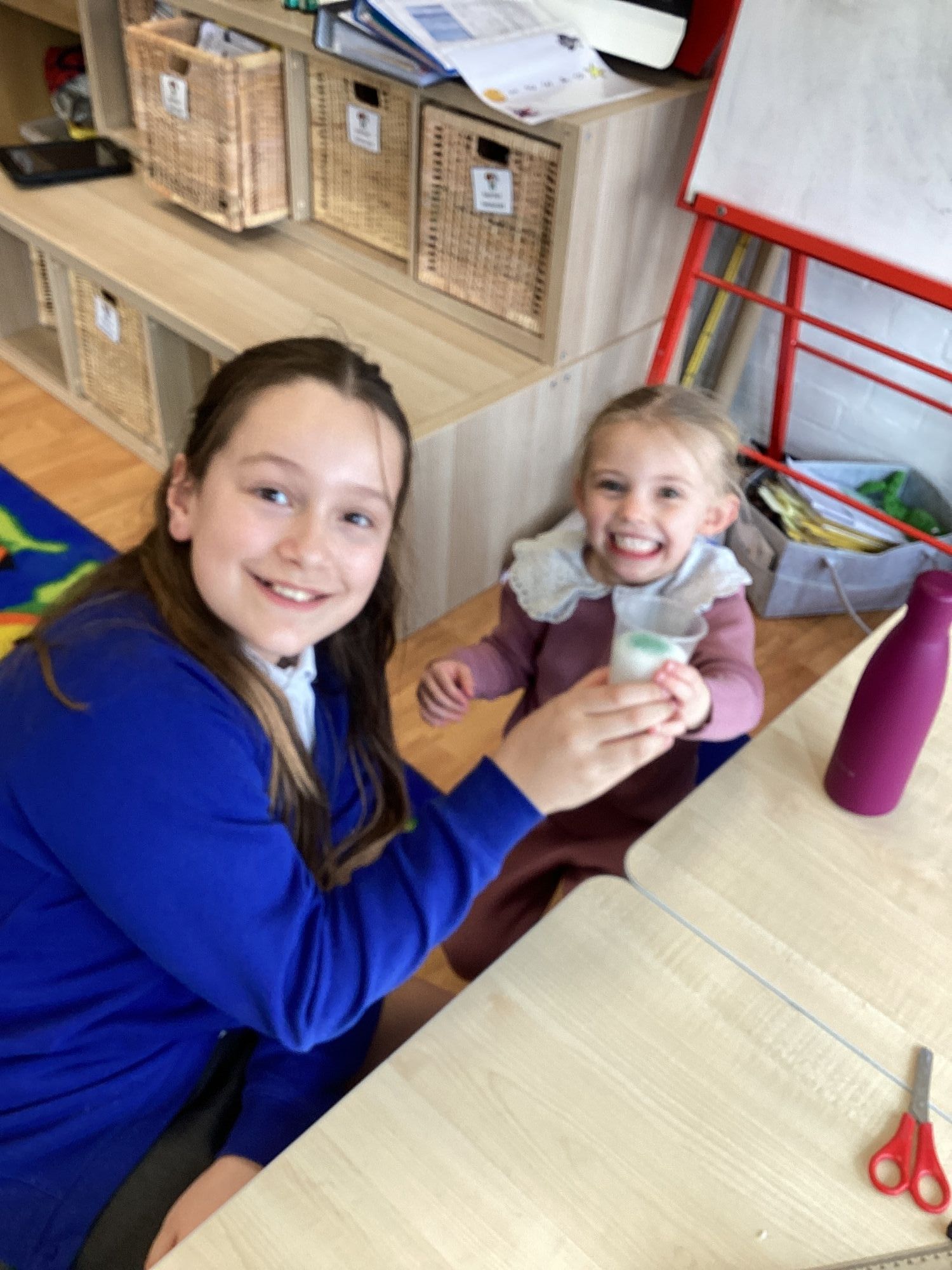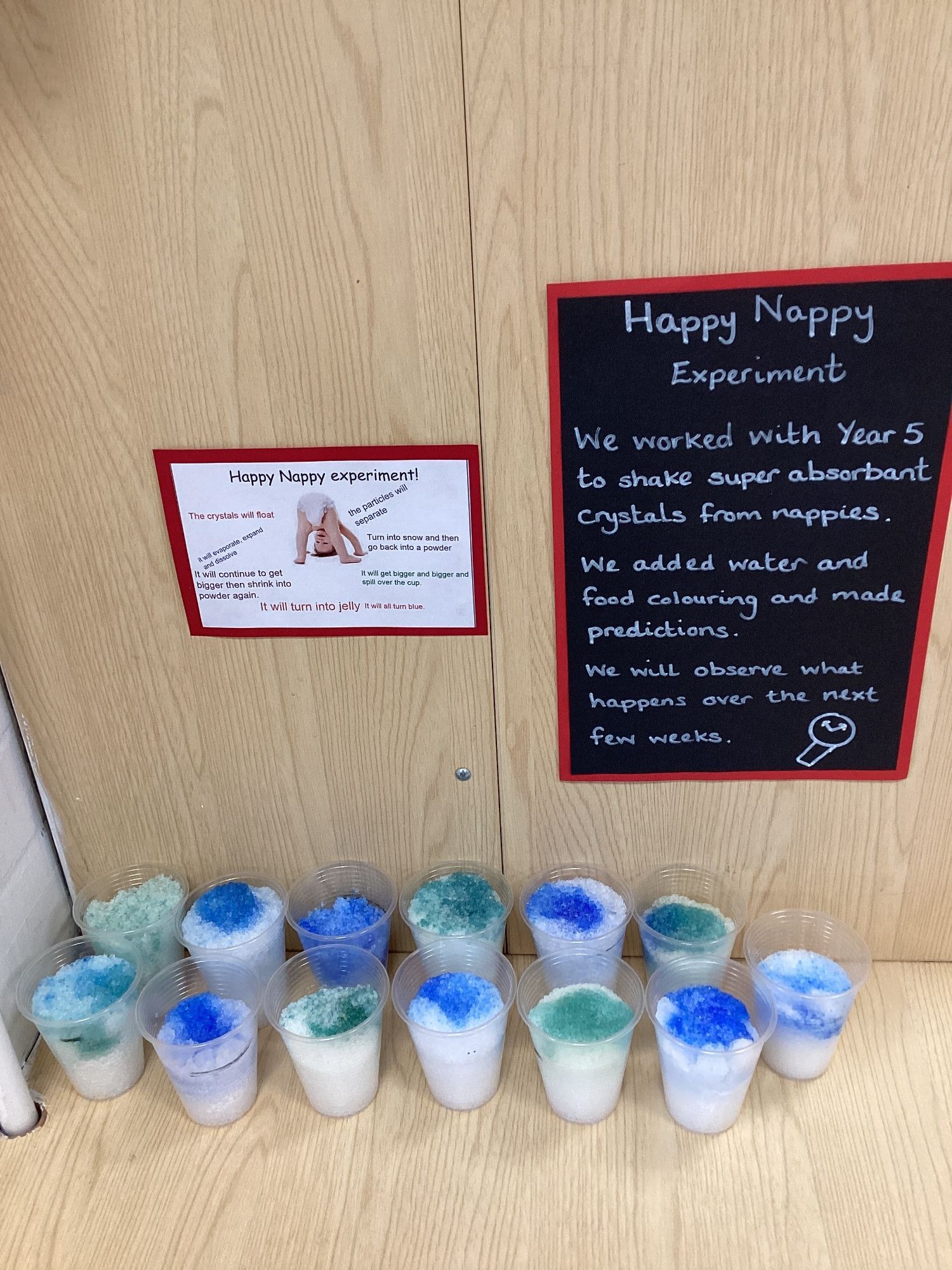 We also took part in Buddy Science experiments - e.g. Year 5 buddied with Year R for the Happy Nappy experiment to look at the properties of water-absorbing crystals in disposable nappies.